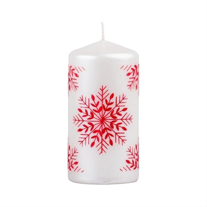 Svíčka válcová s vločkami červeno-bílá 12cm
