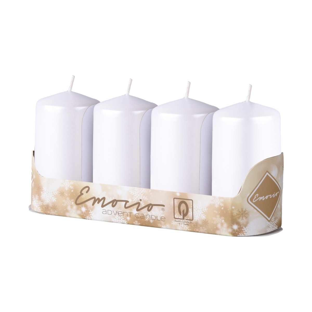 Válcové svíčky s perleťovým povrchem v praktickém balení 4 kusů jsou ideální pro vánoční dekorace a slavnostní aranžmá. UPOZORNĚNÍ: Při hoření nenechávejte svíčku bez dozoru a vždy ji umístěte na nehořlavou podložku.