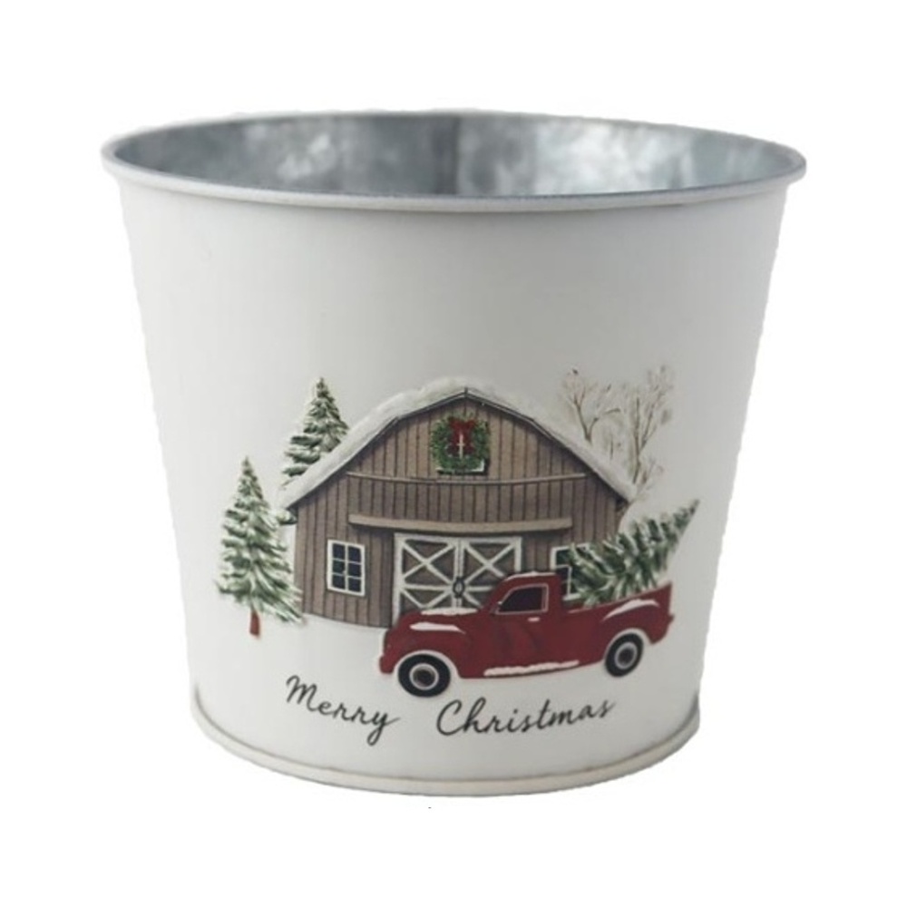Obal kulatý plechový MERRY CHRISTMAS s autem a stodolou bílý 12cm