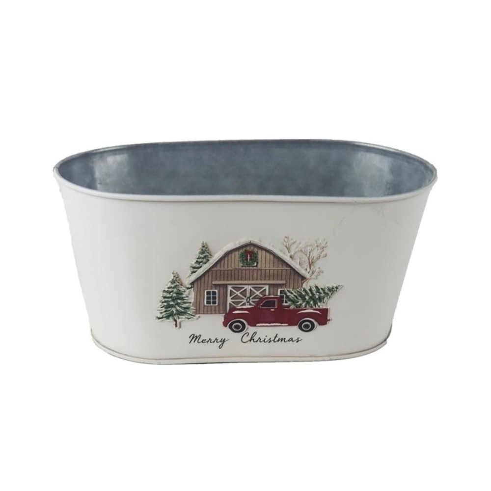 Parametry produktu Obal oválný plechový MERRY CHRISTMAS s autem a stodolou bílý 19cm