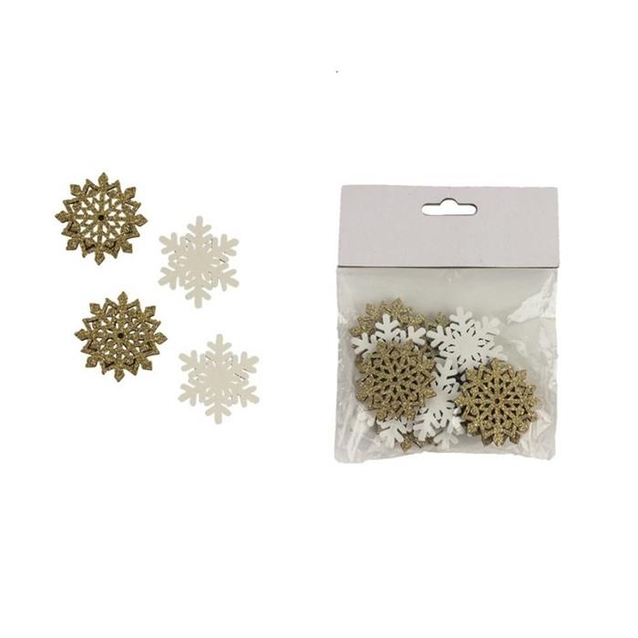 Přízdoba vločka lepící dřevěná s glitry bílá/zlatá mix 3,5cm/12ks