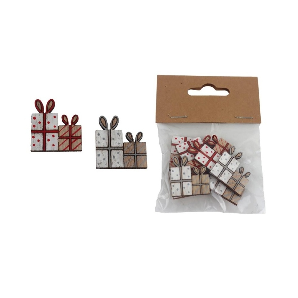 Originální dřevěné přízdoby ve tvaru malých dárků s veselým puntíkovaným dekorem oživí každou vánoční nebo zimní dekoraci. Skvělé pro tvoření s dětmi, balení dárků, výrobu věnců, přáníček aj.