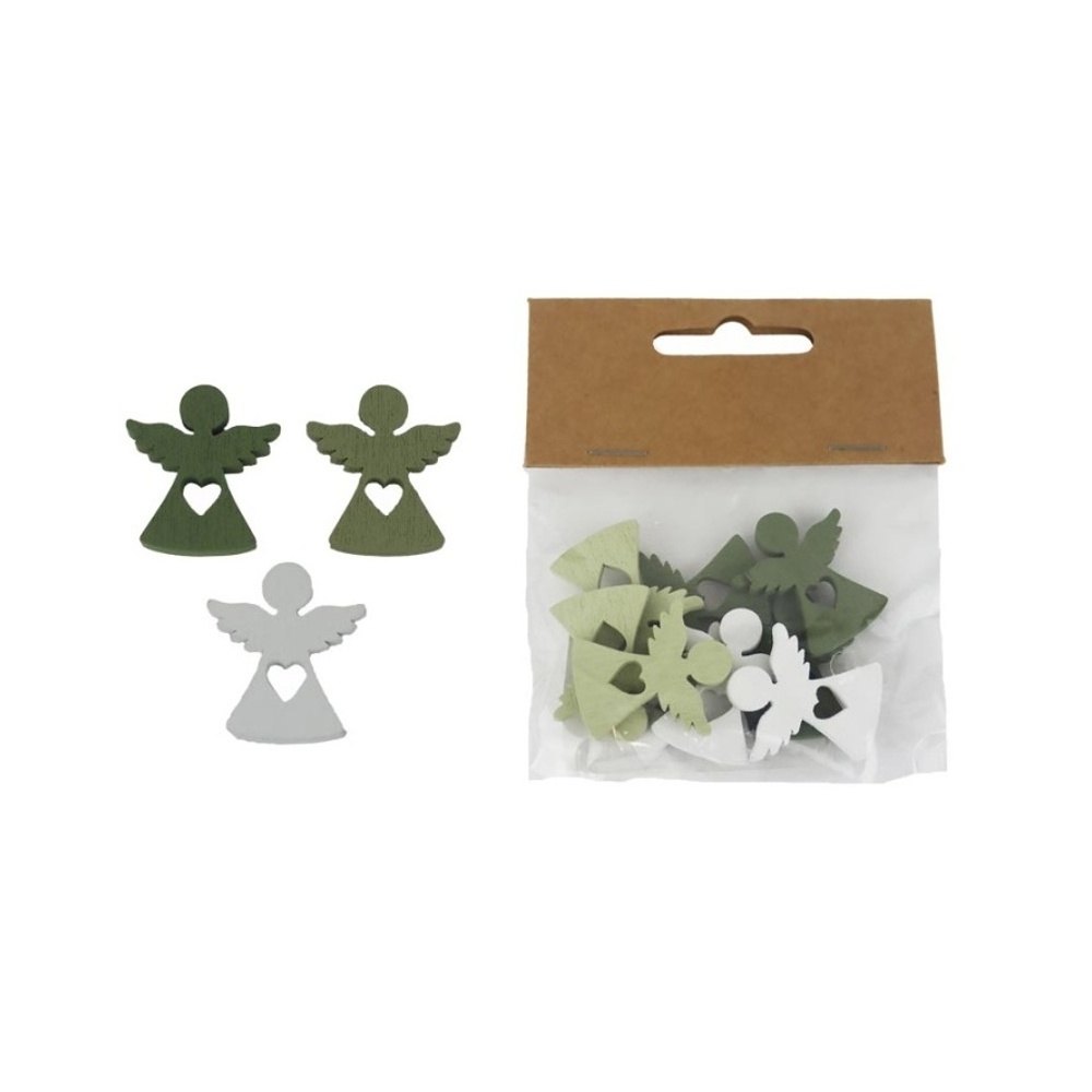 Přízdoba anděl dřevěný se srdcem bílá/zelená mix 3cm/9ks