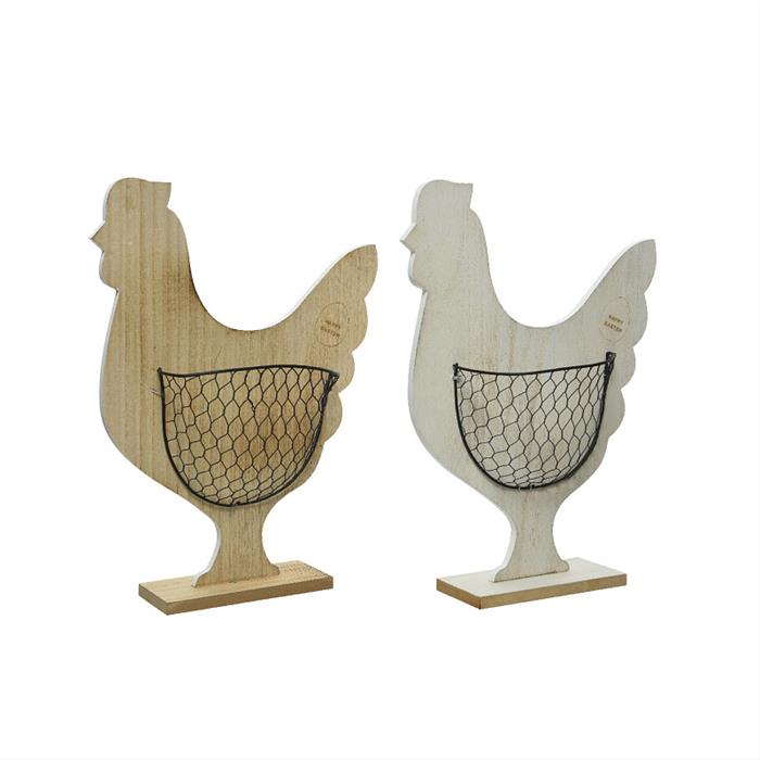 Dekorativní slepice na podstavci s kapsou je vyrobena ze dřeva s praktickou kapsou z pletiva, ideální pro velikonoční aranžmá nebo jako stylová dekorace na stůl. Pečlivé zpracování a přírodní materiály dodávají dekoraci autentický vzhled a rustikální šarm.