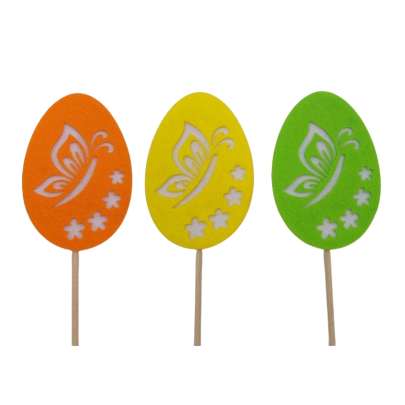 Vajícˇko je zdobené malým motýlkem, který dodává dekoraci hravý a jemný vzhled. Produkt je dodáván v mixu barev a motivů, takže si můžete vytvořit pestré a originální aranžmá.