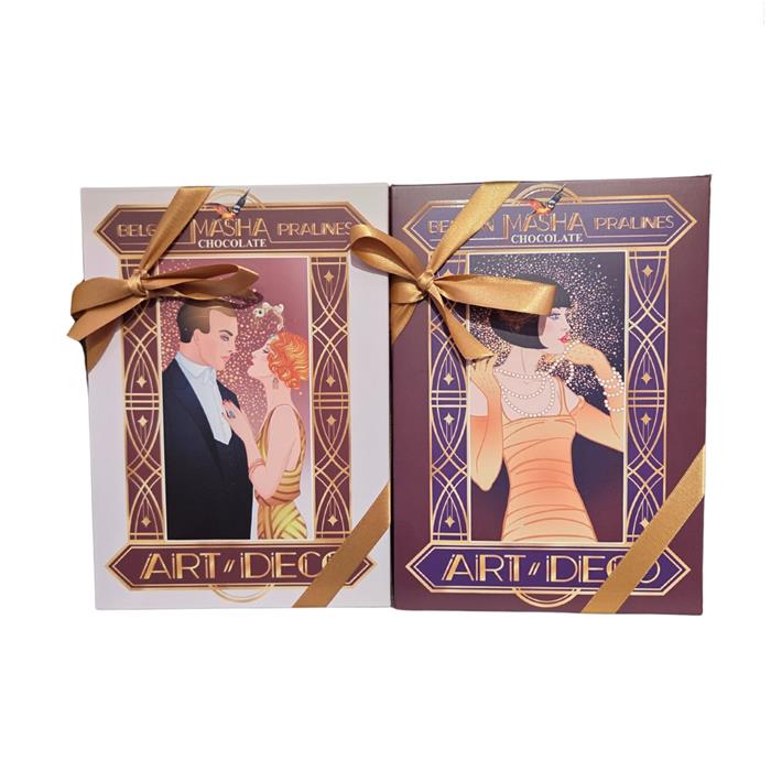 Bonboniéra s bonbony z belgické mléčné čokolády s lískooříškovým nugátem a lískovým oříškem.