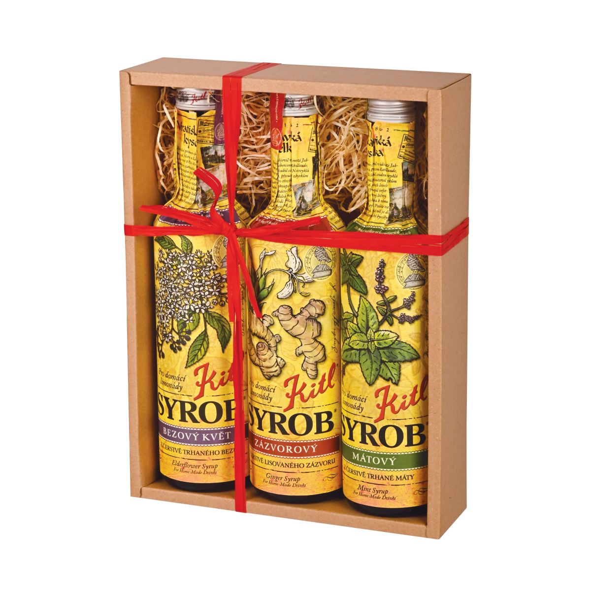Dárkové balení Bylinných sirupů Kitl. Obsahuje 3x 500 ml – Kitl Syrob Bezový, Kitl Syrob Zázvorový a Kitl Syrob Mátový.