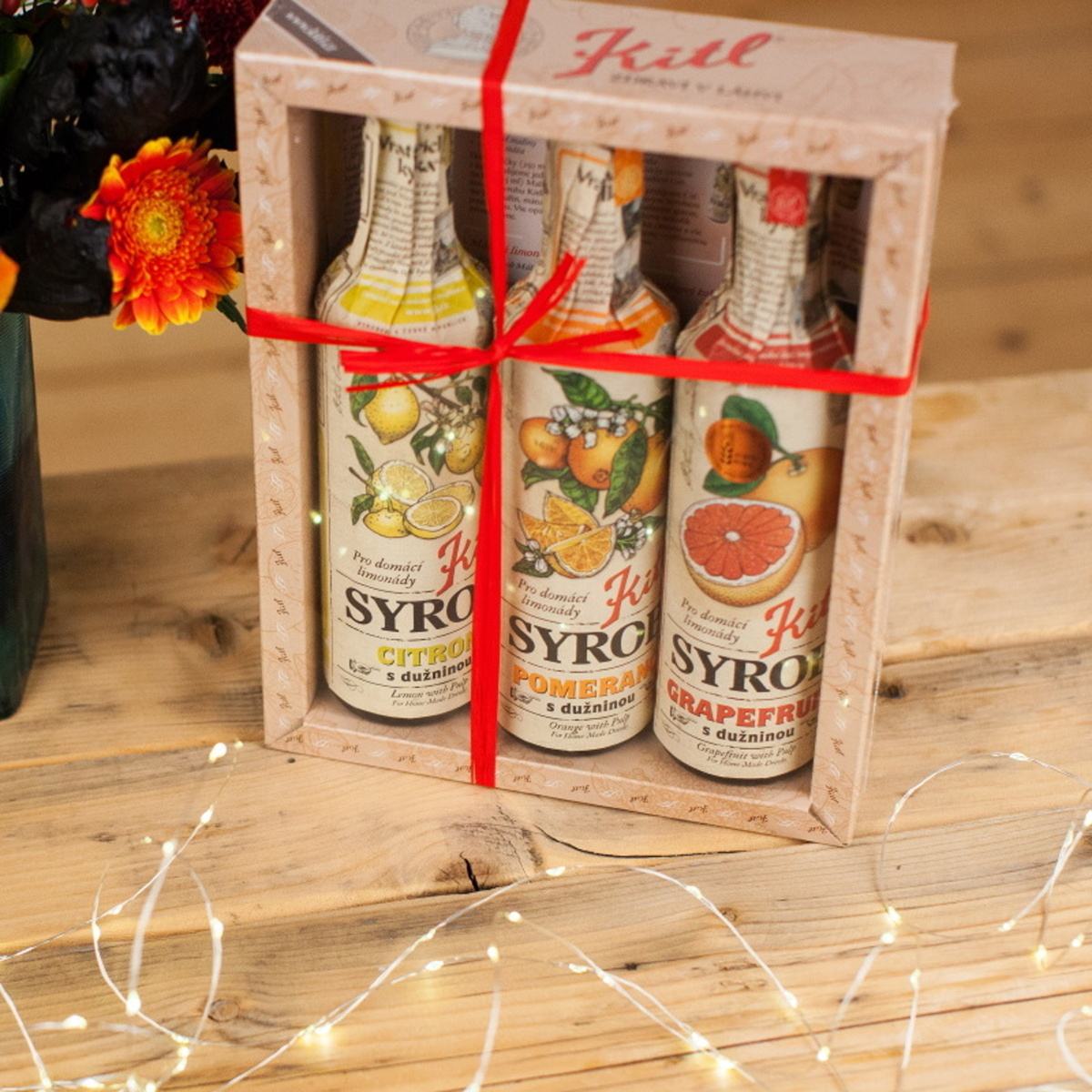 Dárková kazeta sirupů Kitl z citrusů obsahující Kitl Syrob Pomeranč, Citron a oblíbený Grapefruit. Tyto sirupy jsou ideální na osvěžující koktejly a domácí limonády.