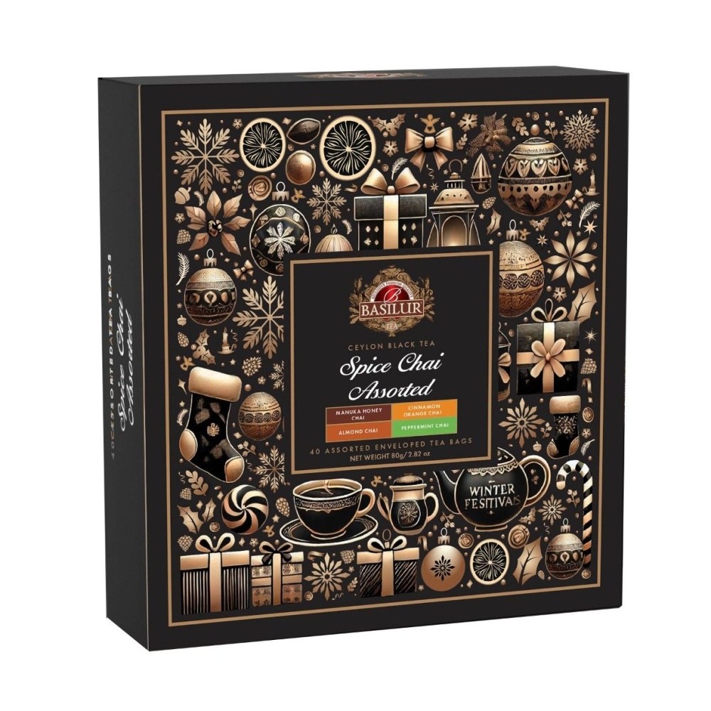 Dárková kazeta černých kořeněných čajů s příchutí medu Manuka, máty, mandle a pomeranče.