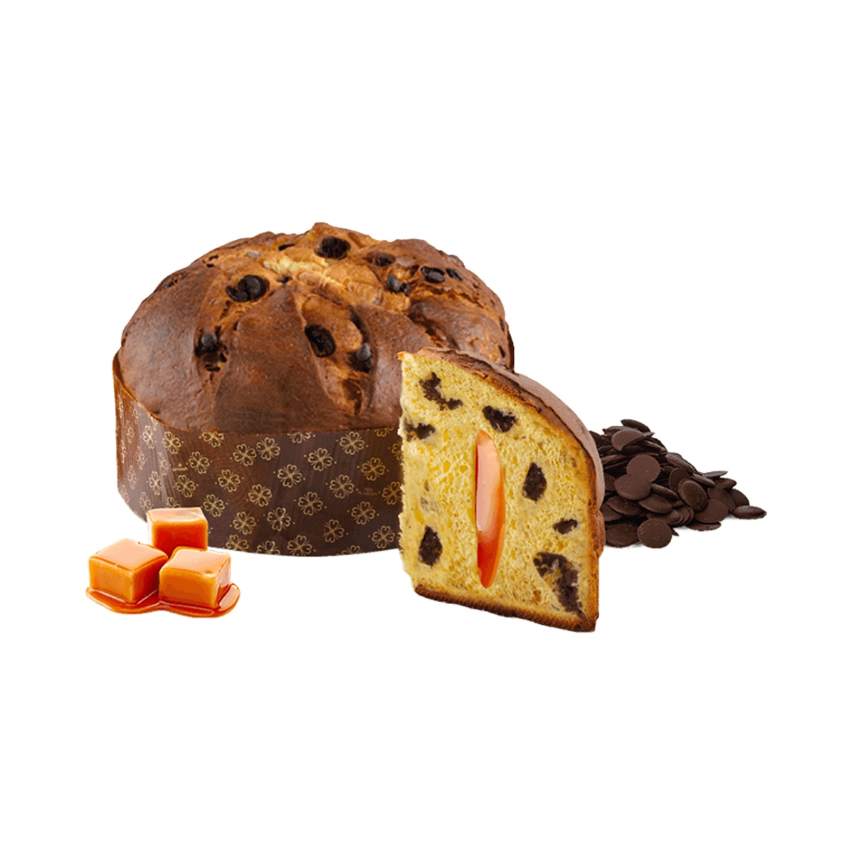 Italský panettone s hořkou čokoládou a slaným karamelem které je vhodné pro všechny kdo milují kontrast chutí!. Nadýchané a jemné těsto s kousky hořké čokolády a delikátním slaným karamelem, který dodává dezertu sofistikovanou chuťovou rovnováhu.