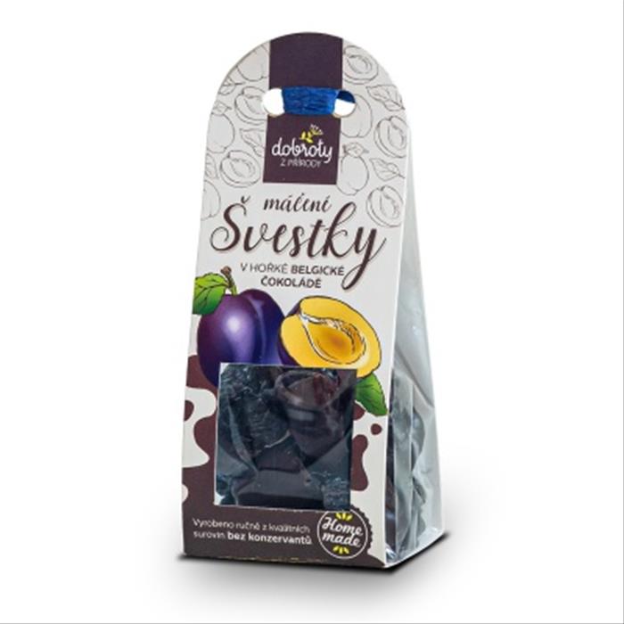 Složení: švestky bez konzervantů 78 %, hořká belgická čokoláda 22 % (kakaová hmota, cukr, kakaové máslo, emulgátor: sojový lecitin, přírodní aroma vanilky), obsah kakaové sušiny v čokoládě nejméně 57,8 %.