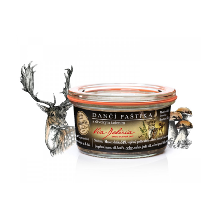 Daněk byl považován za královskou lovnou zvěř chovanou v mnoha panských oborách. Nyní se vyskytuje celkem hojně i ve volných honitbách. Má vynikající, chuťově výrazné maso podobné jelenímu. V naší paštice jsme dančí maso zkombinovali s divokým kořením, bylinkami a lesními houbami. Doporučujeme ochutnat společně s výraznějším červeným vínem.