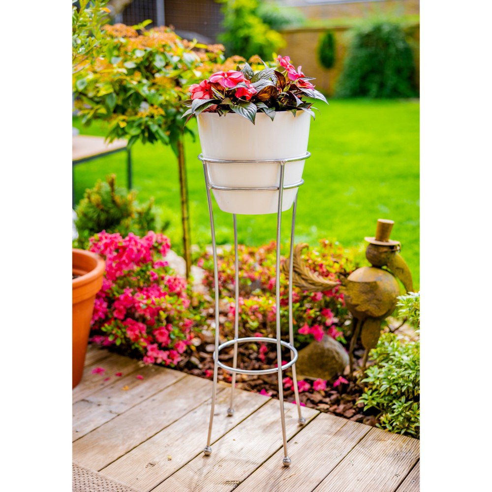 Jednoduchý kovový stojan, který vkusně doplní vaši terasu či vchod do domu. Úprava materiálu: před lakováním povrchu probíhá tryskání ocelových broků a automatické odmaštění/fosfátování, poté lakování v práškové lakovně a následně vypalování při cca 200 °C po dobu cca 20 minut. Výsledkem je hladká, antikorozní barva a celoroční užívání na zahradě.
