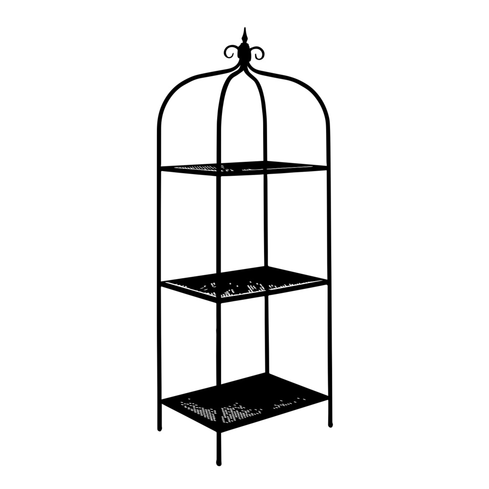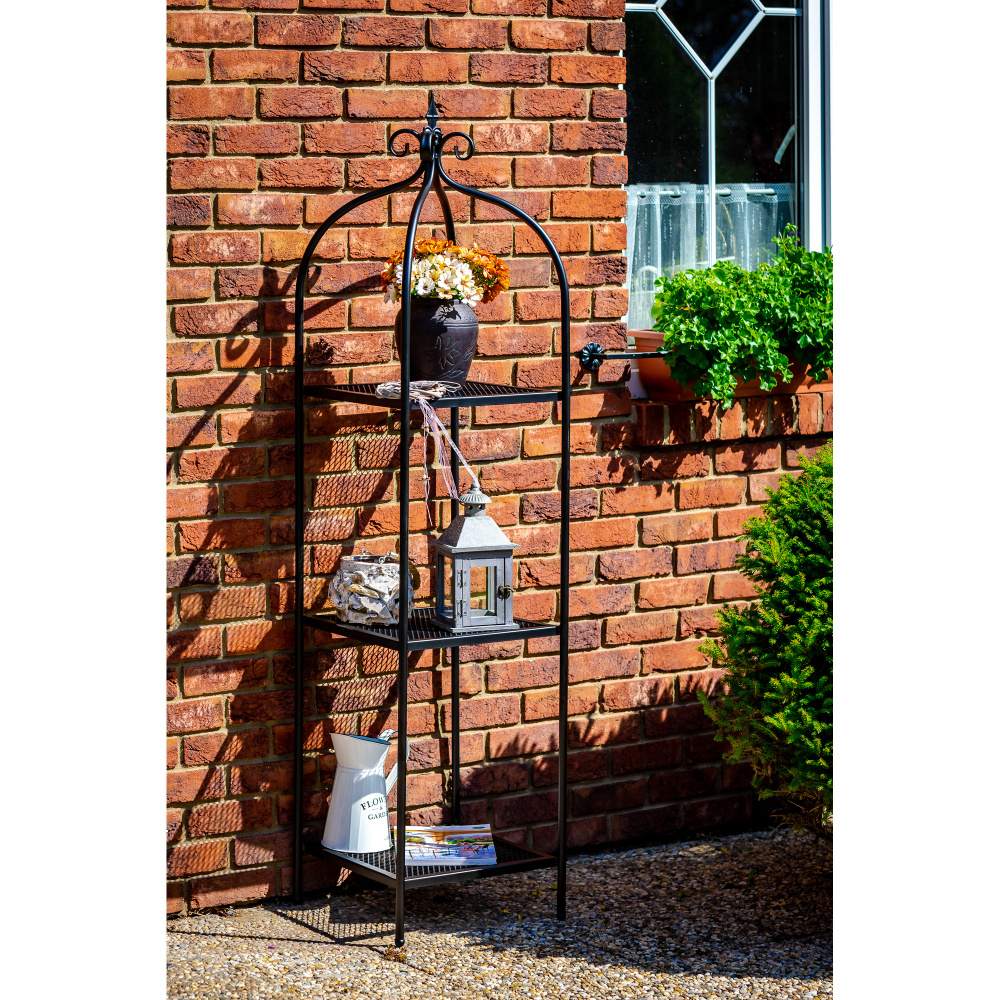 Pevný kovový regál pro rostliny odolný korozi a změnám počasí. Nahoře je zakončen ozdobnou špičkou. Úprava materiálu: před lakováním povrchu probíhá tryskání ocelových broků a automatické odmaštění/fosfátování, poté lakování v práškové lakovně a následně vypalování při cca 200 °C po dobu cca 20 minut. Výsledkem je hladká, antikorozní barva a celoroční užívání na zahradě.