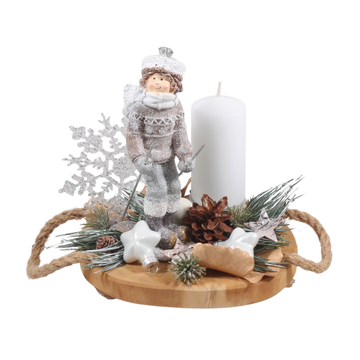 Vneste do svého domova kouzlo zimní atmosféry s ledovým svícnem, který zdobí detailně zpracovaná figurka lyžaře, sněhové vločky, jelhličí a ozdob. To vše je krásně naaranžovánao na dřevěném podnose. Tento dekorativní kousek působí dojmem mrazivého ledu a dokonale doplní zimní či vánoční výzdobu.
